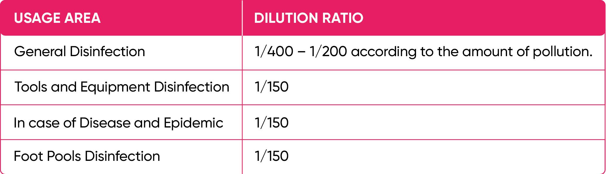 It is also used for cleaning and disinfection of animal hospitals and shelters, barns, poultry houses, all kinds of machinery and equipment, incubators, vehicles for animal transportation, slaughterhouses,